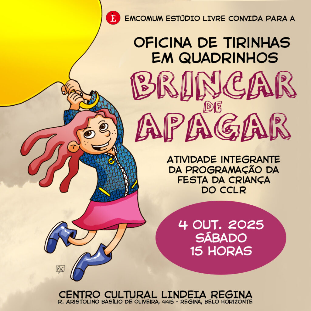 Emcomum Estúdio Livre convida para a oficina de tirinhas em quadrinhos: Brincar de Apagar. Atividade integrante da programação da Festa da Criança do Centro Cultural Lindeia Regiona, Regional Barreiro, Belo Horizonte/MG.